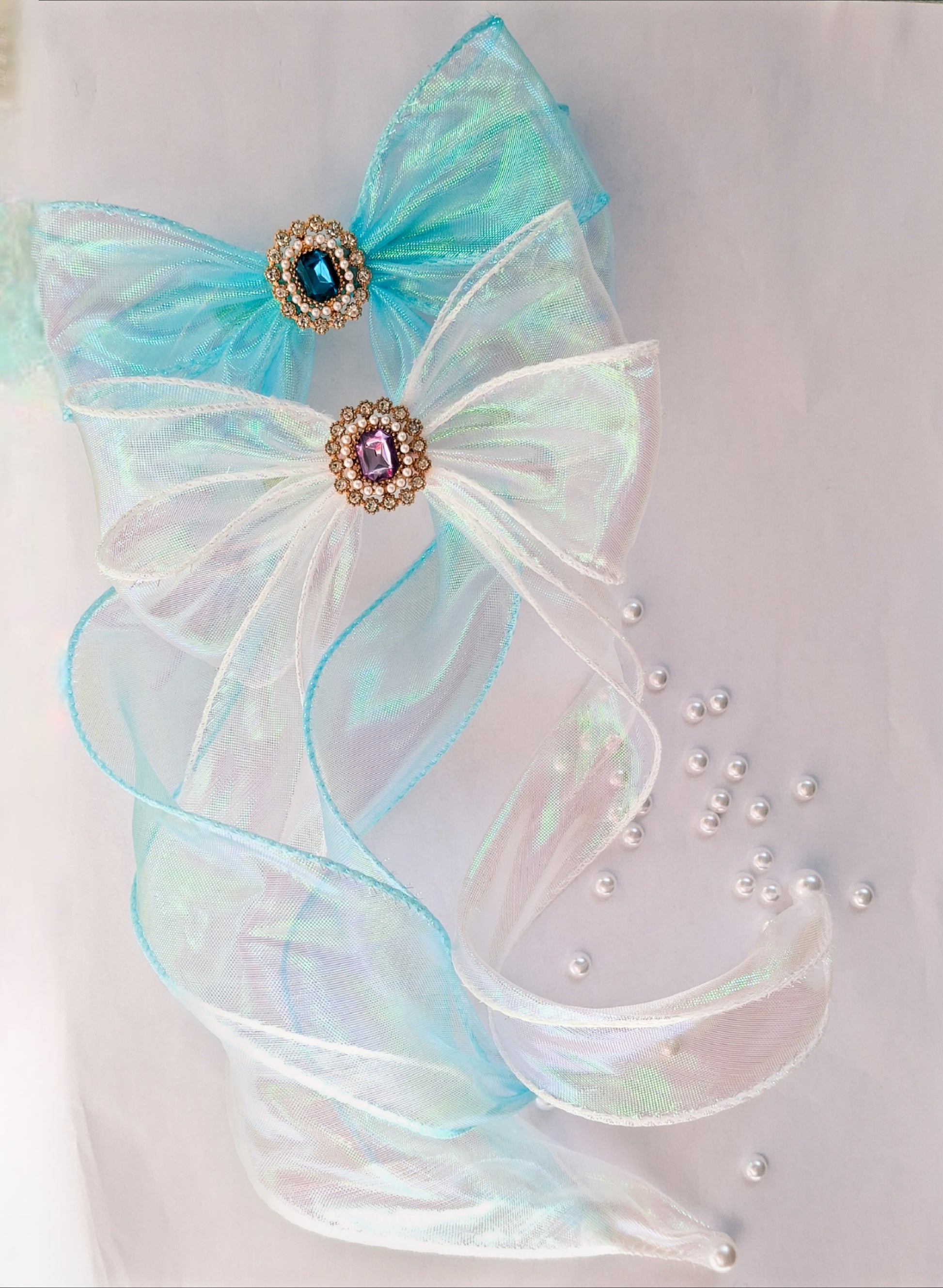 Flowing ribbons with pearl tips create a dreamy princess style—ideal for portraits, parties, and special occasions in white or blue.