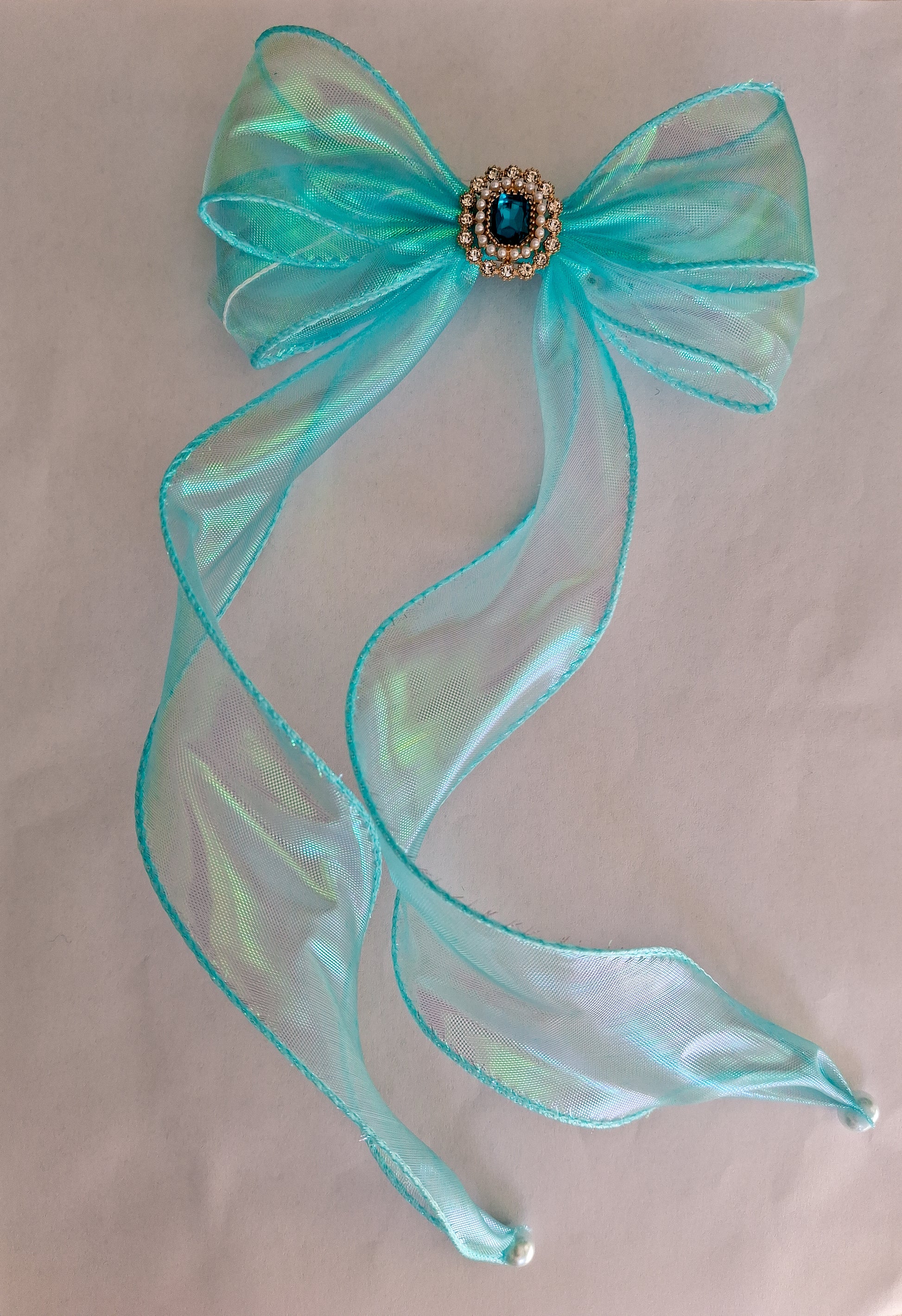 Crystal Jewel Organza Ribbon Hair Clip | Pearl-Tipped Long Bow